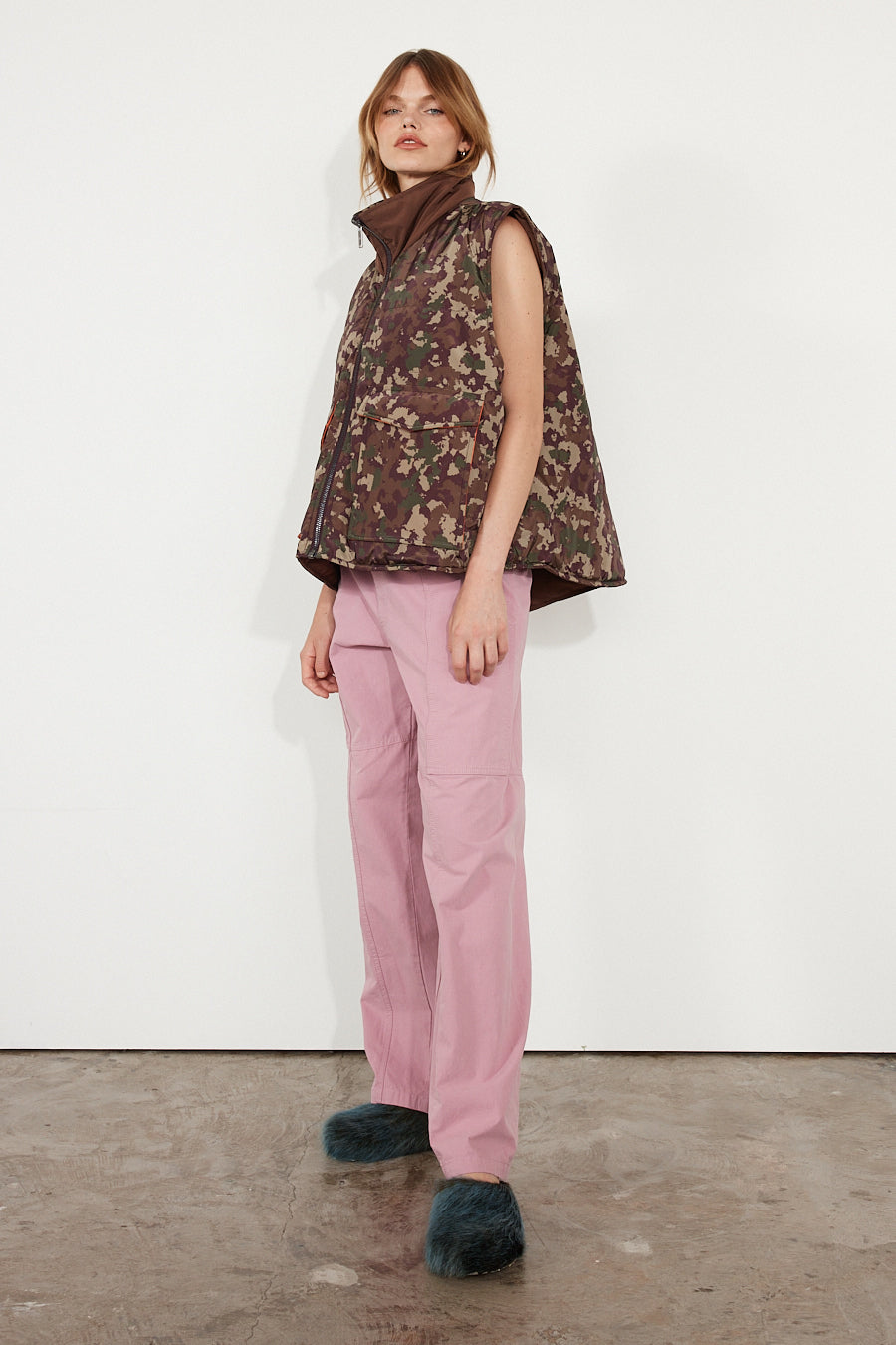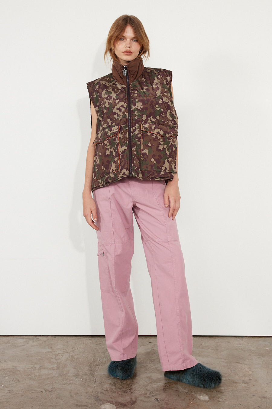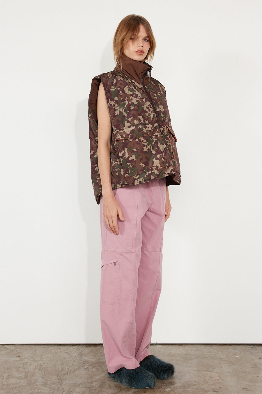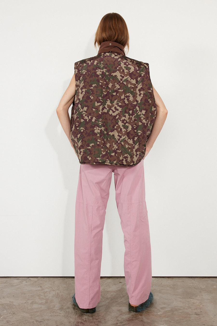 Our reversible camouflage vest is cut for an oversized boxy fit. As this versatile piece is designed to be layered, it is lightly padded and features a funnel collar, extended back hem and zip front closure.