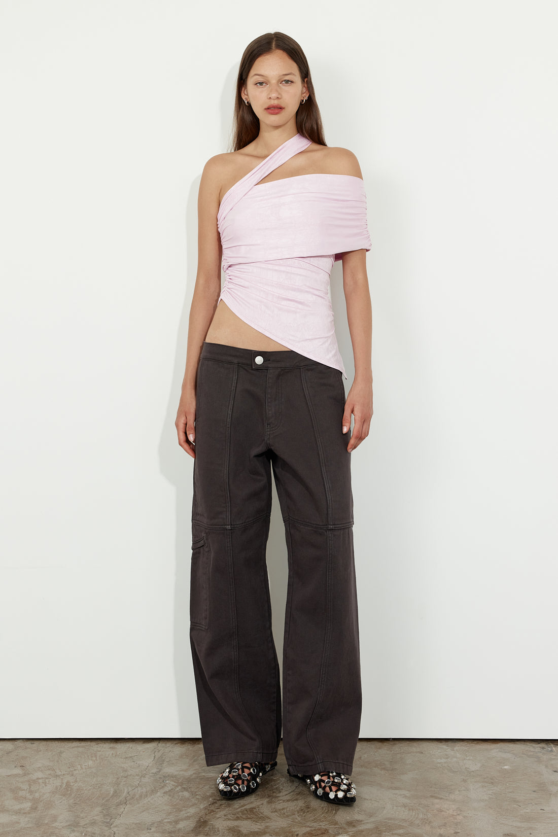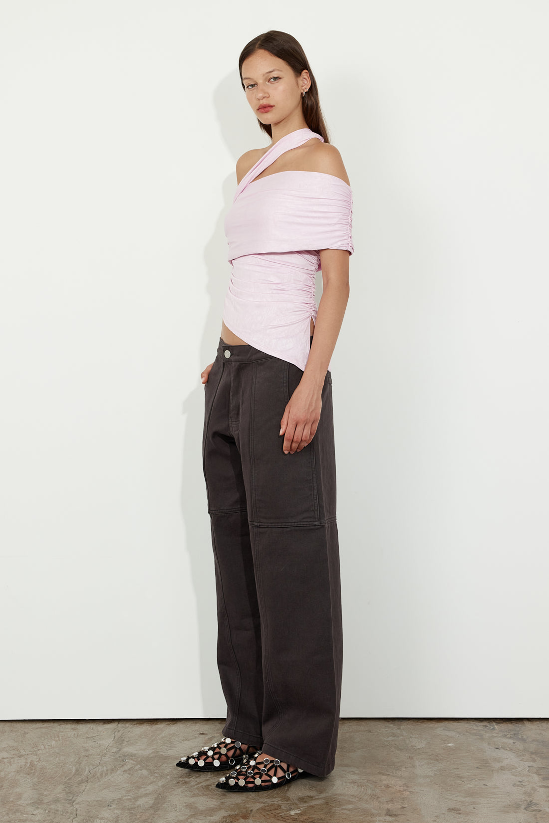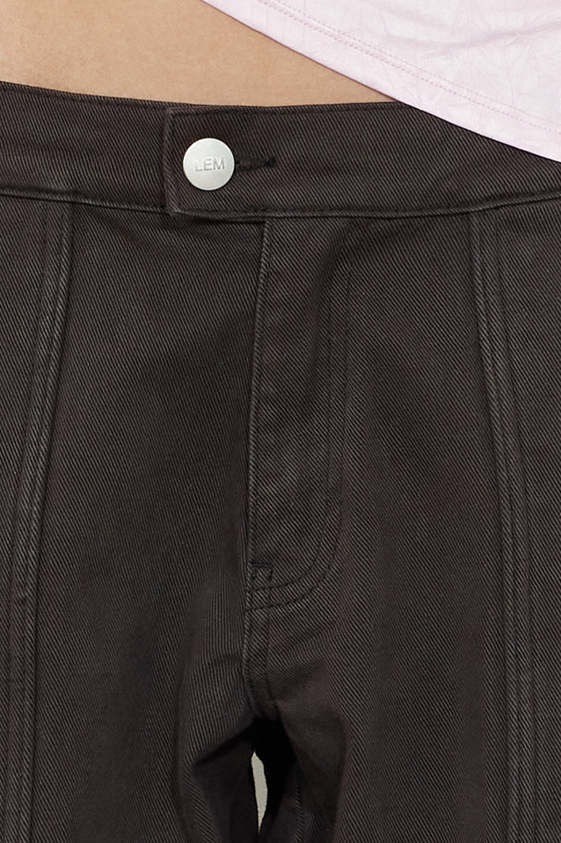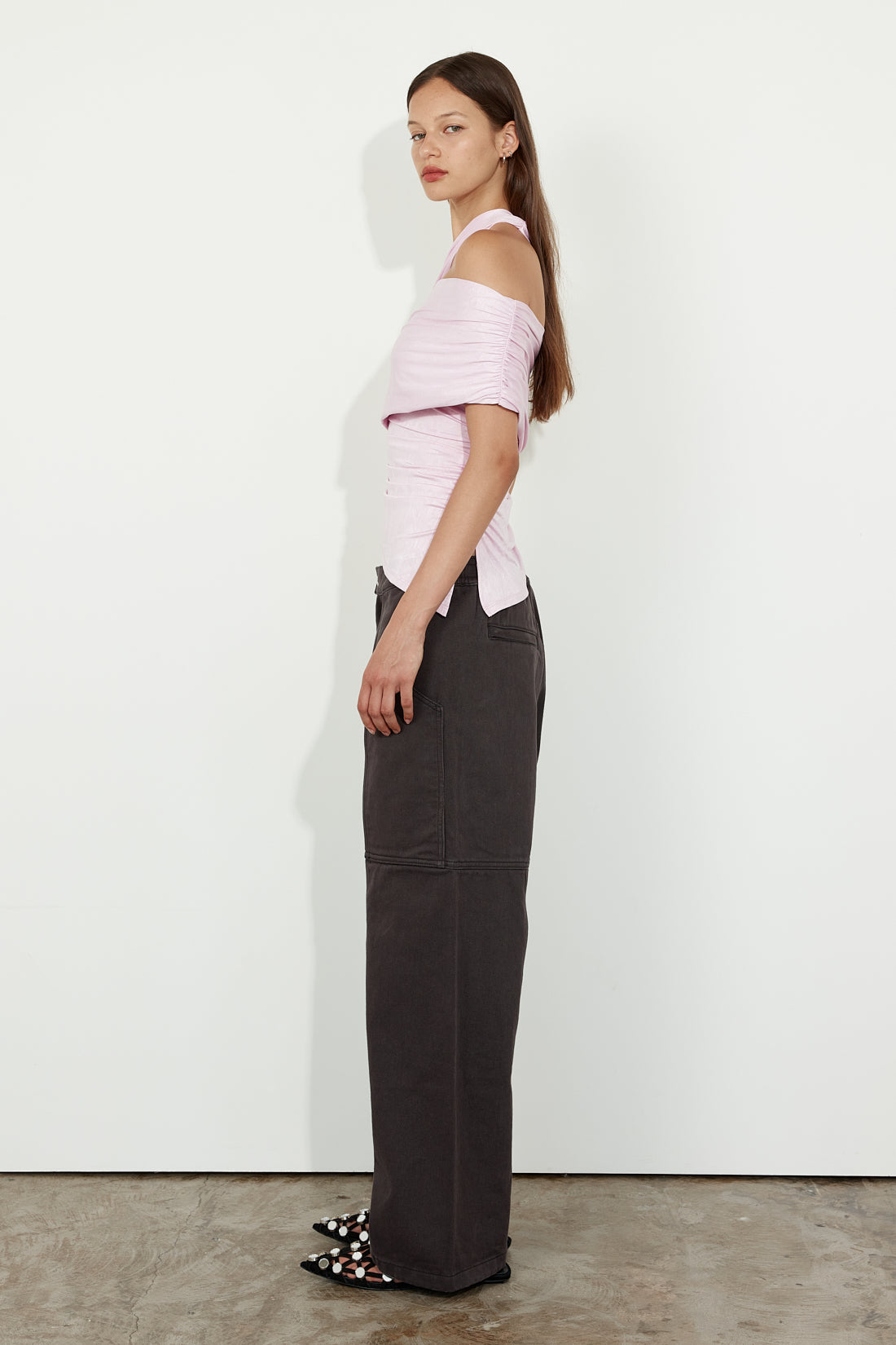 A clean, structured silhouette with subtle utility detailing. The Utility Wide Leg Pant is cut from cotton drill with exposed seam lines and a mid-waist fit that sits comfortably just below the natural waist. Finished with a single button closure and minimal hardware.