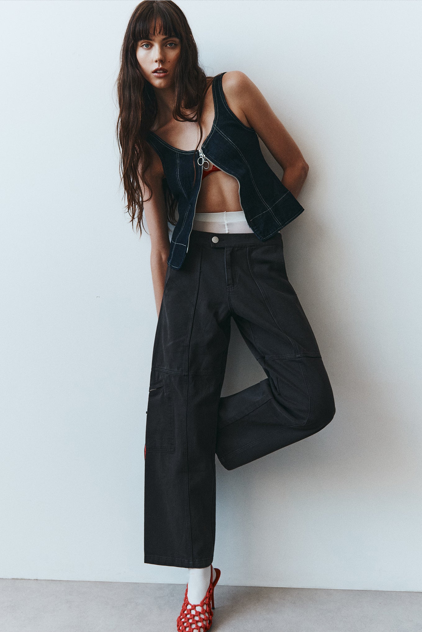 A clean, structured silhouette with subtle utility detailing. The Utility Wide Leg Pant is cut from cotton drill with exposed seam lines and a mid-waist fit that sits comfortably just below the natural waist. Finished with a single button closure and minimal hardware.