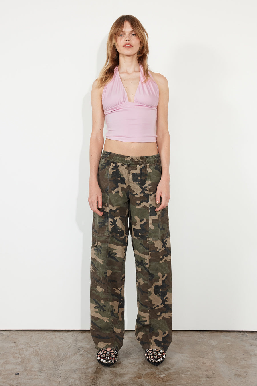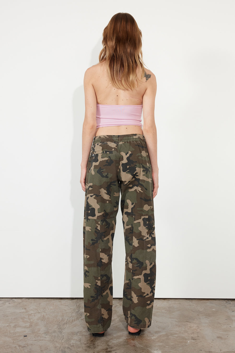 Our signature versatility pant is characterised by a relaxed fit. Rendered in a camouflage print, the fabric has been garment dyed and washed for a worn and lived-in feel. Due to its elasticated waistband and adjustable drawcord, the pant can be worn mid waist or relaxed on the hip. Our pant features multi-pocket styling - a concealed knee zip pocket, waist pockets and a welt back pocket. With functionality in mind, it also offers an adjustable leg feature with an internal button, to alter your desired hem length.