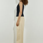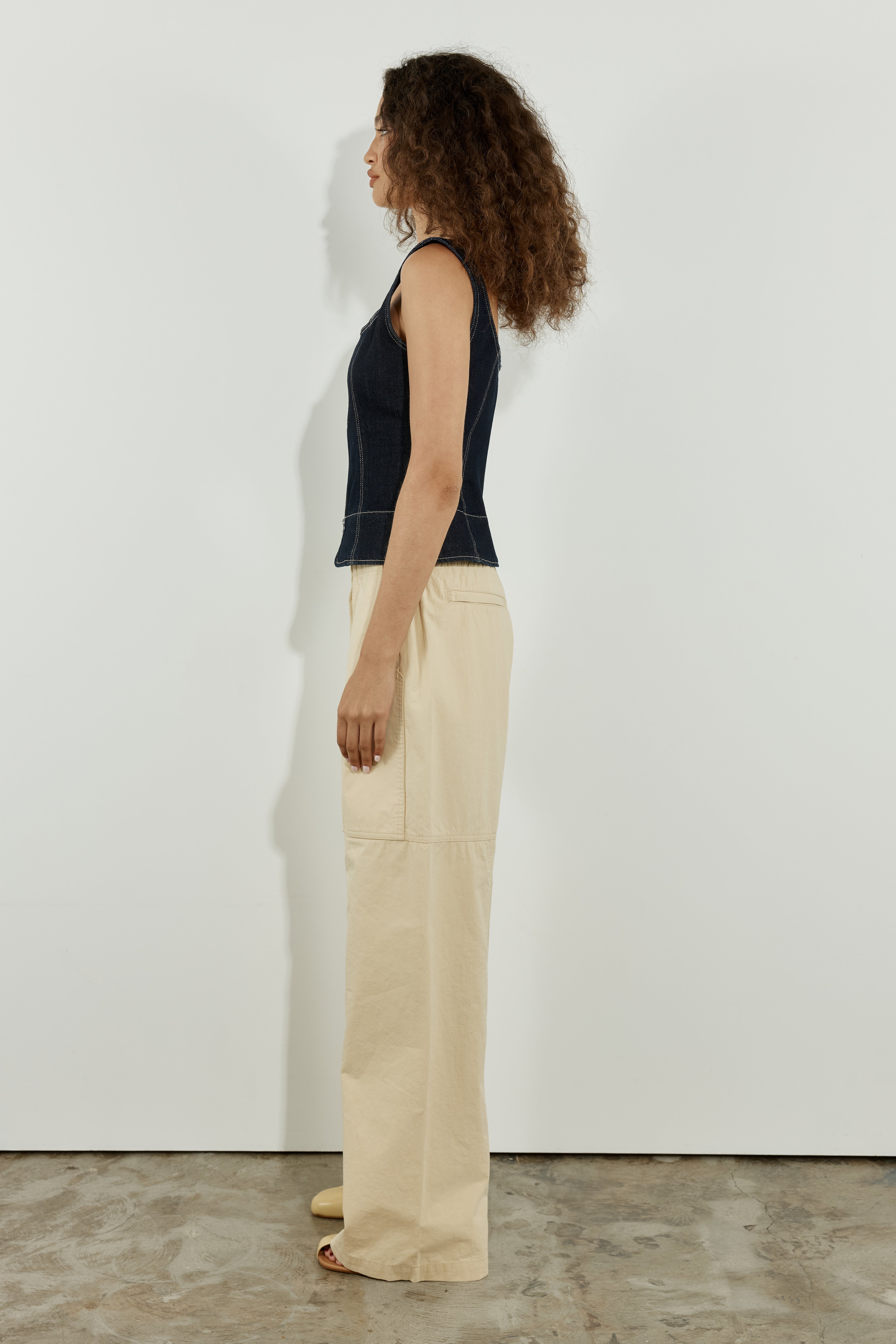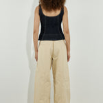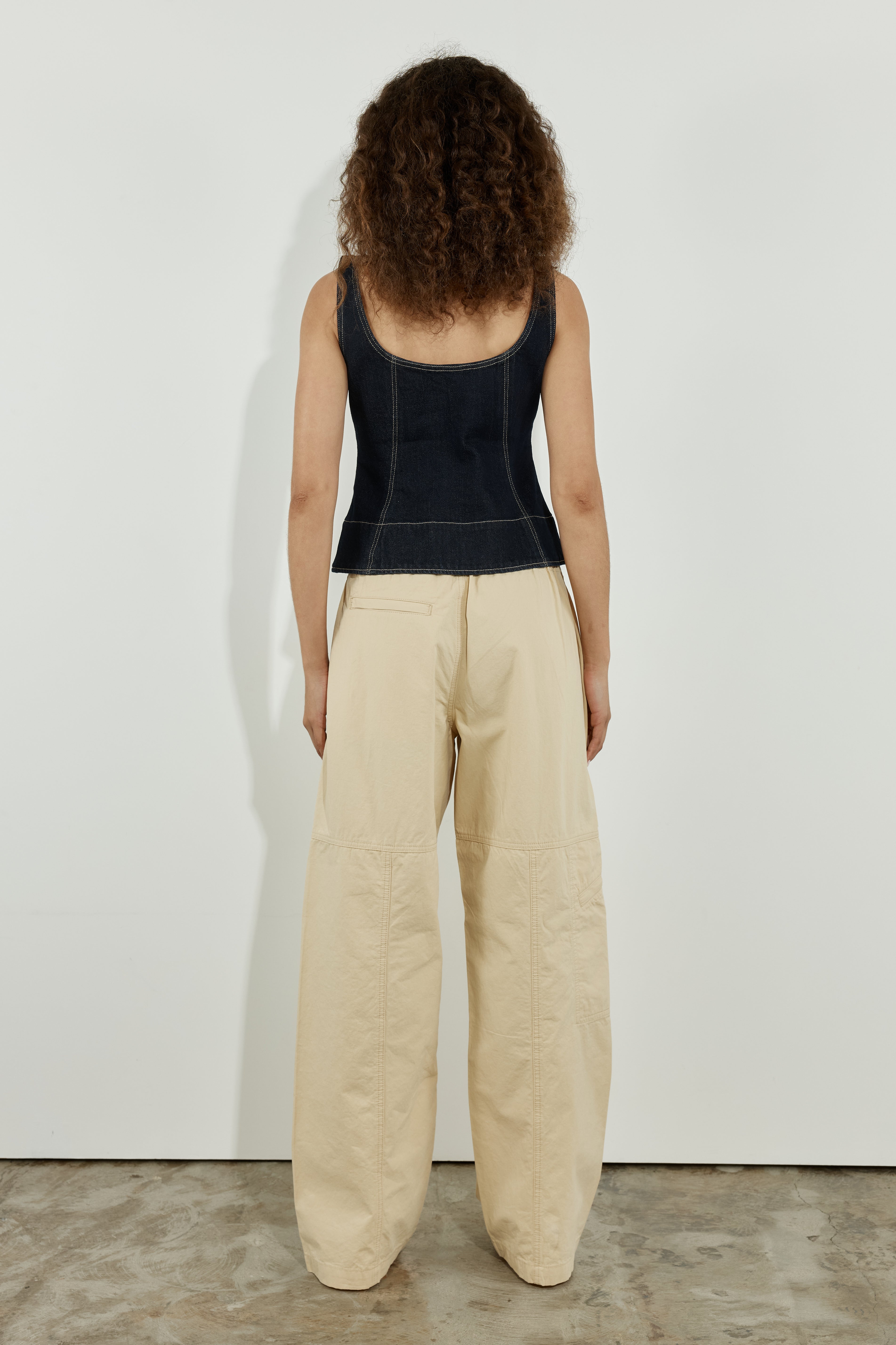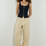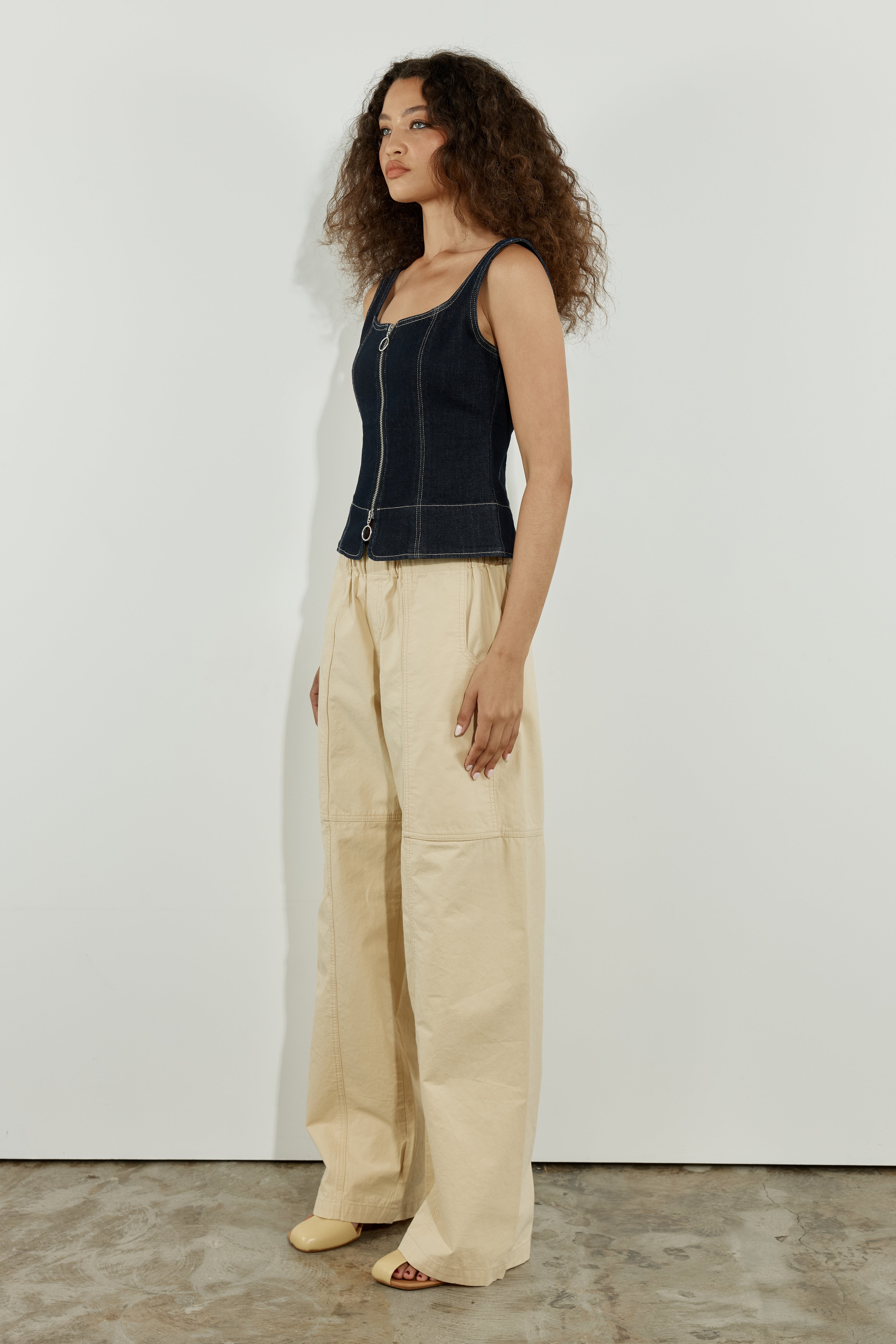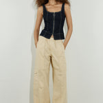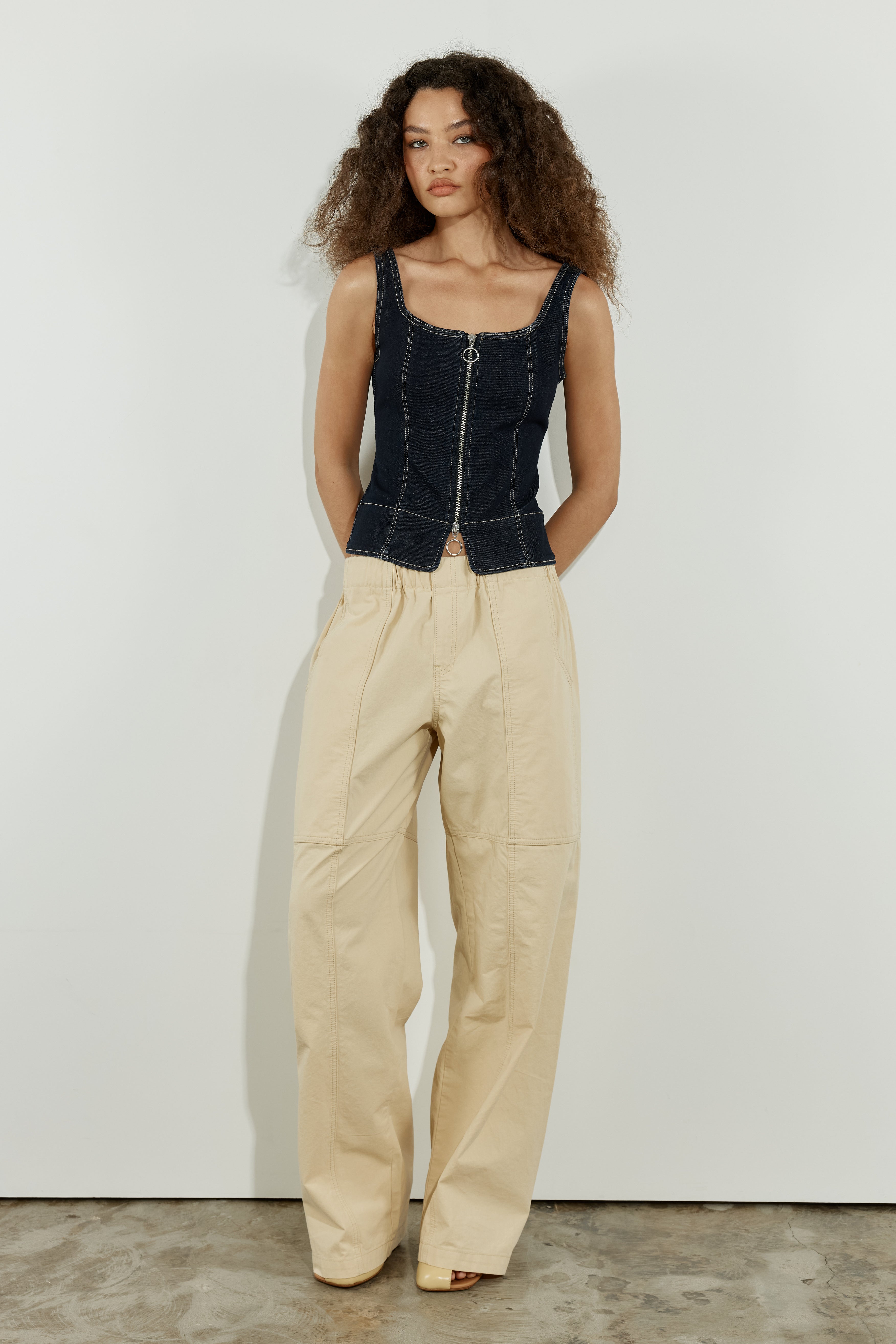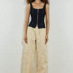 Crafted from stretch denim, this fitted corset top features a scoop neckline, contour seaming, and a two-way front zip with ring pull detailing. Designed to shape the body while offering comfort and flexibility.