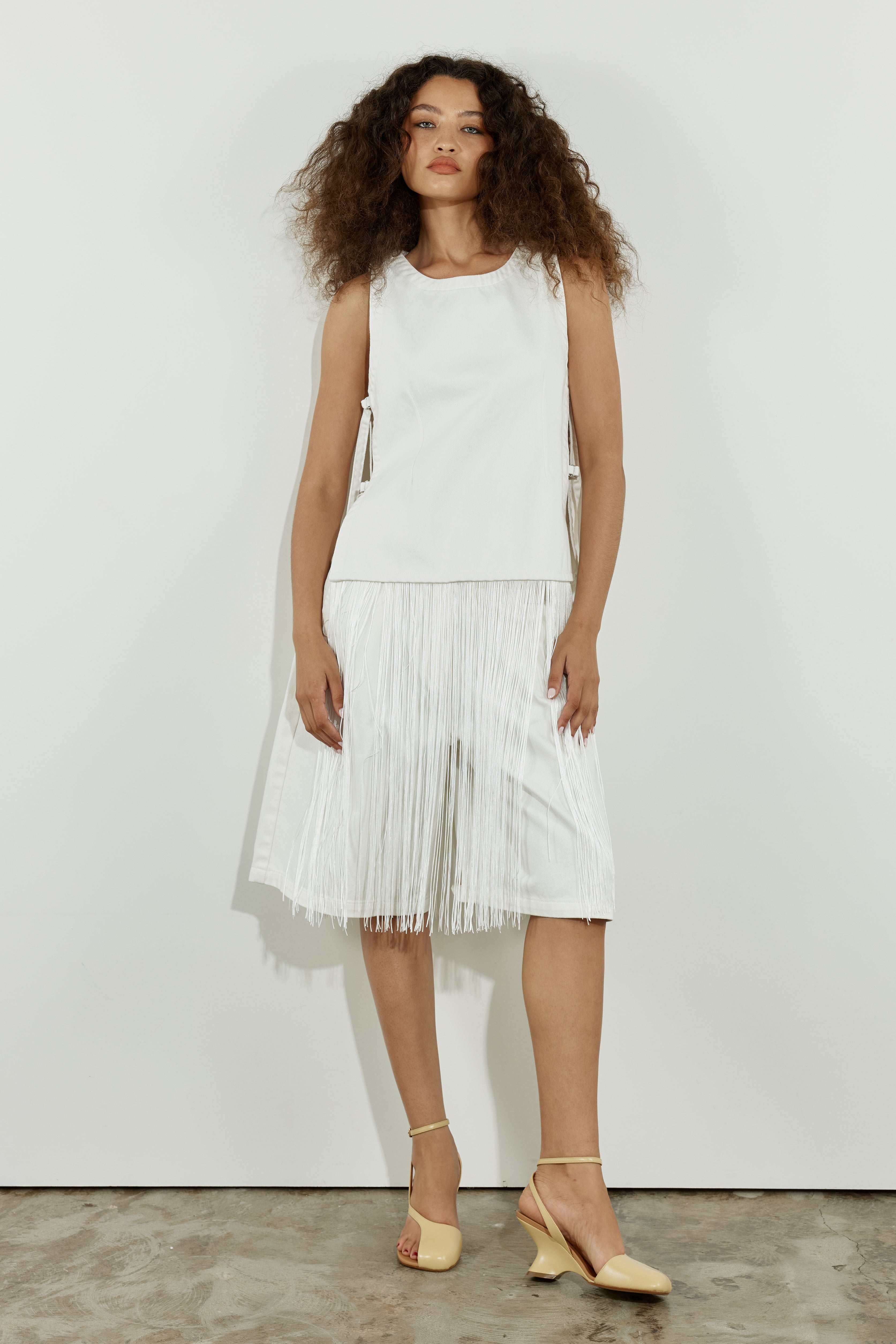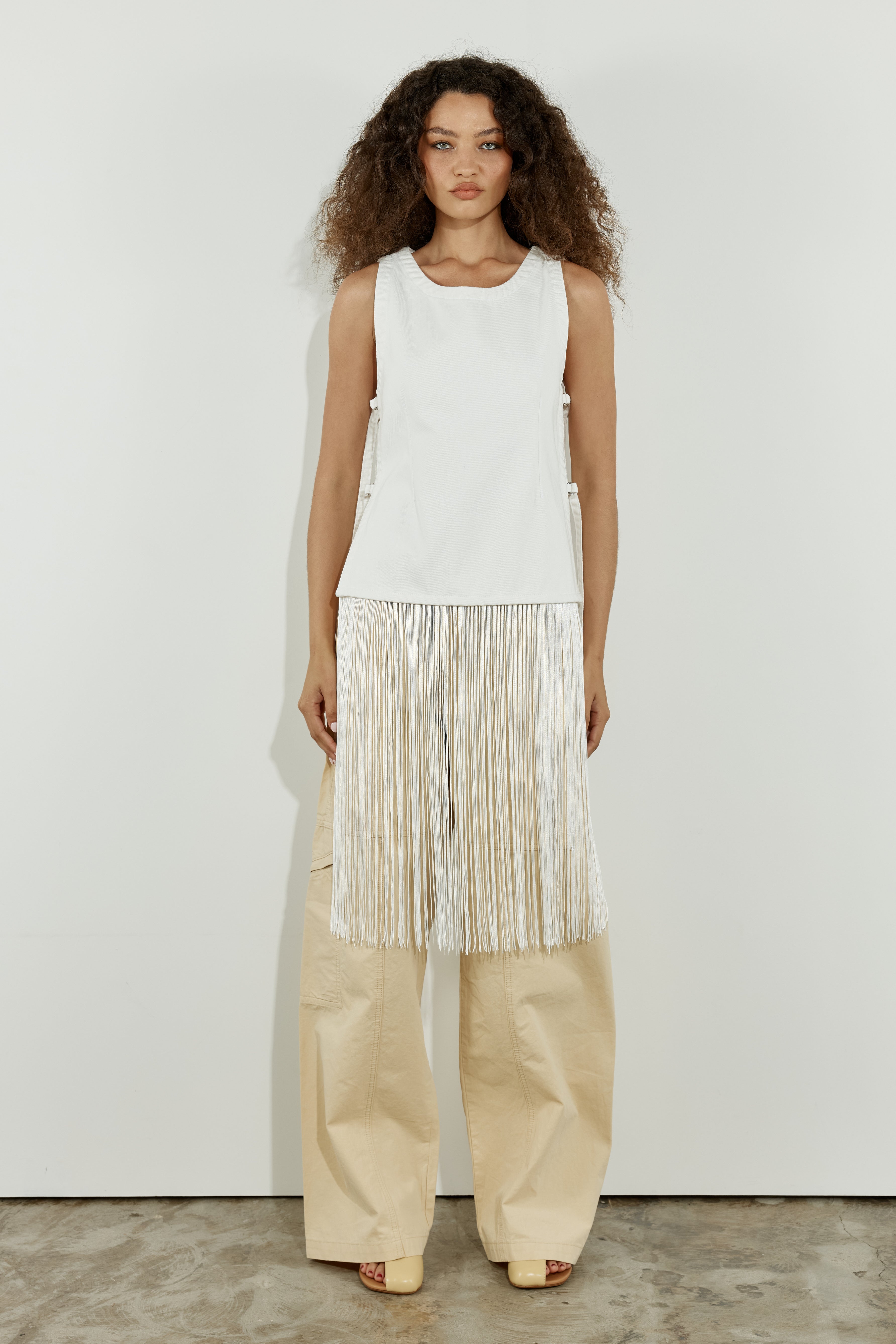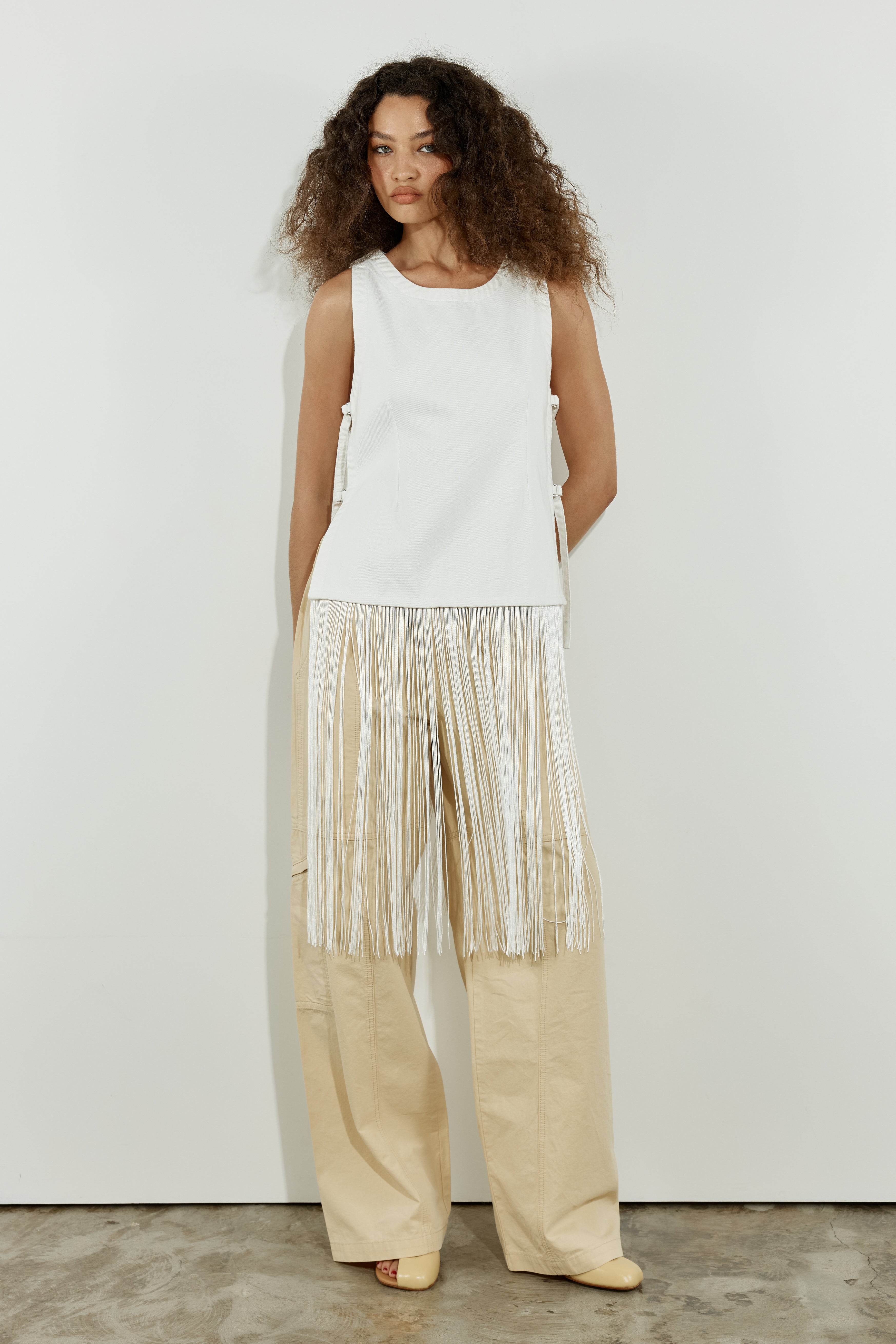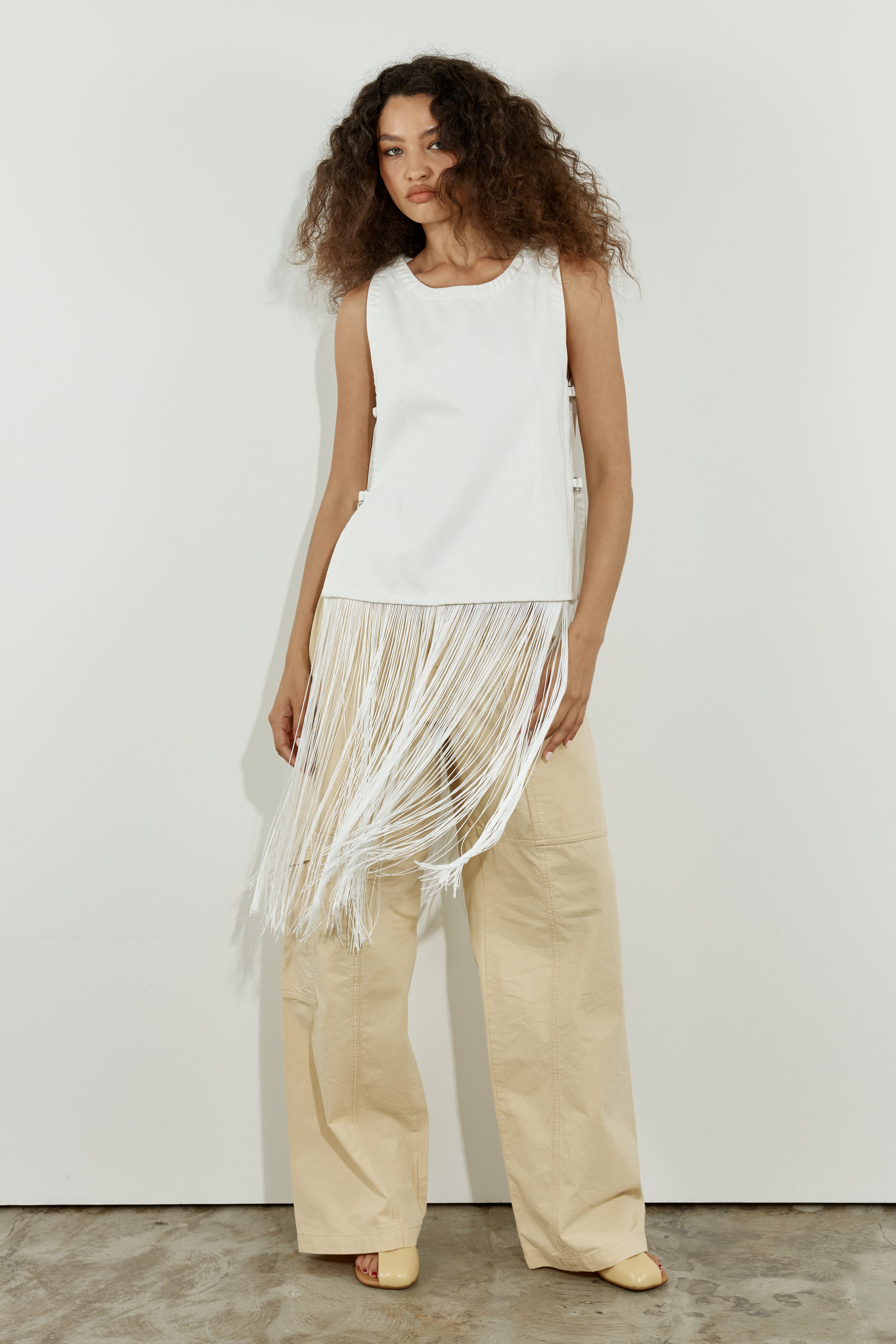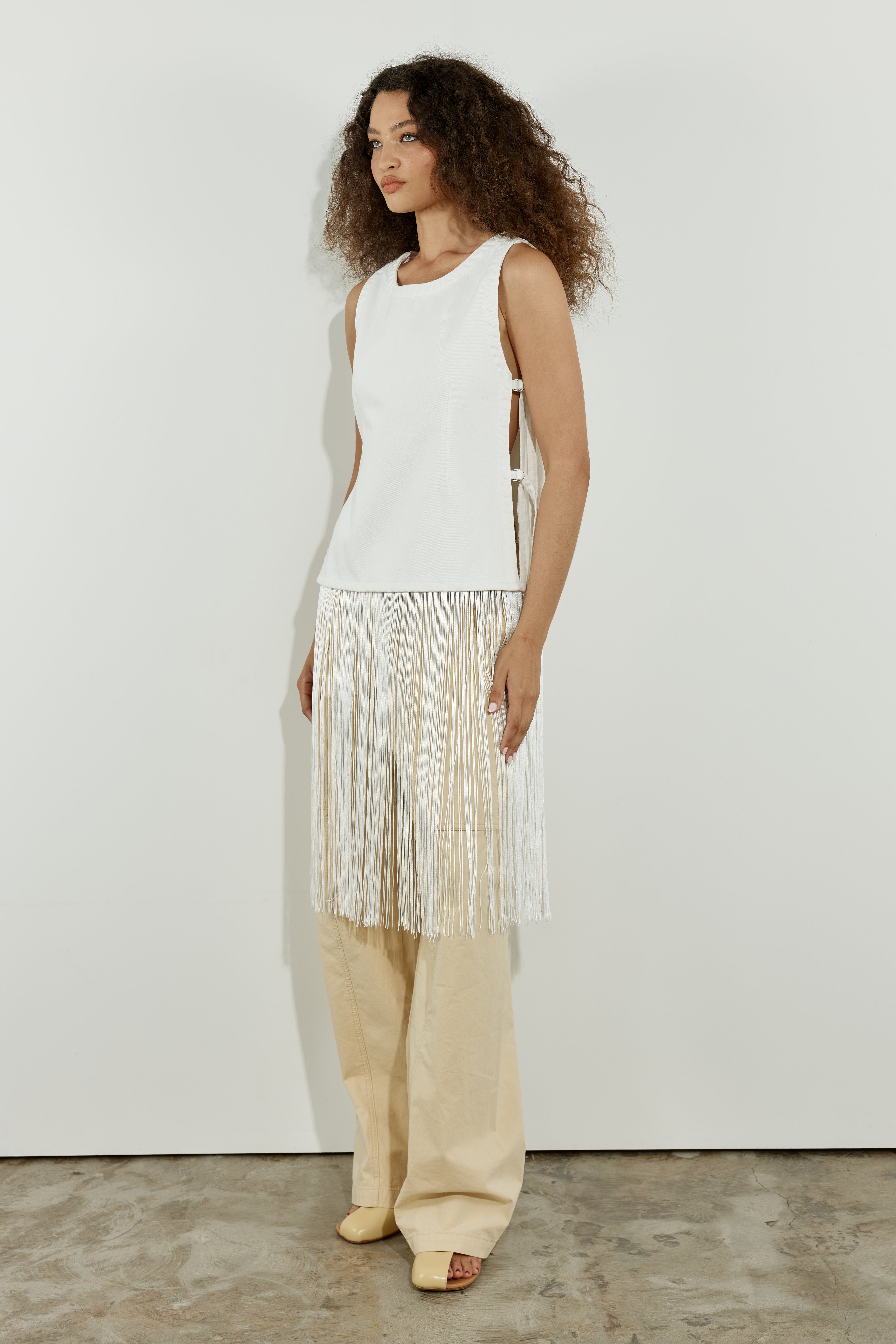 A sleeveless denim tank featuring adjustable side strap fastenings and long fringe detailing. Structured through the body with open sides for a clean, modern finish.