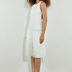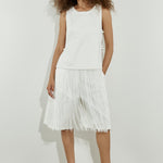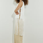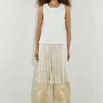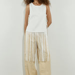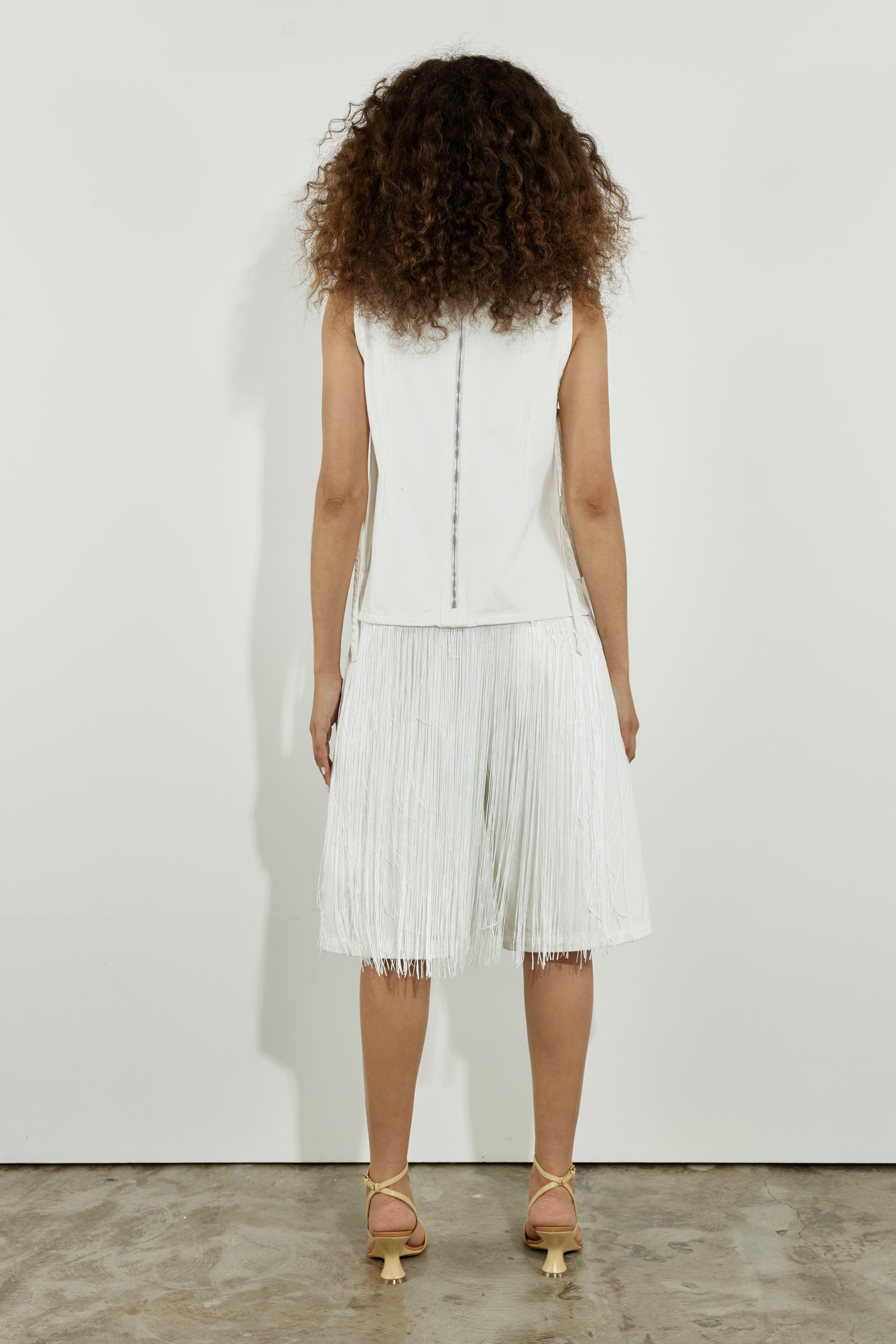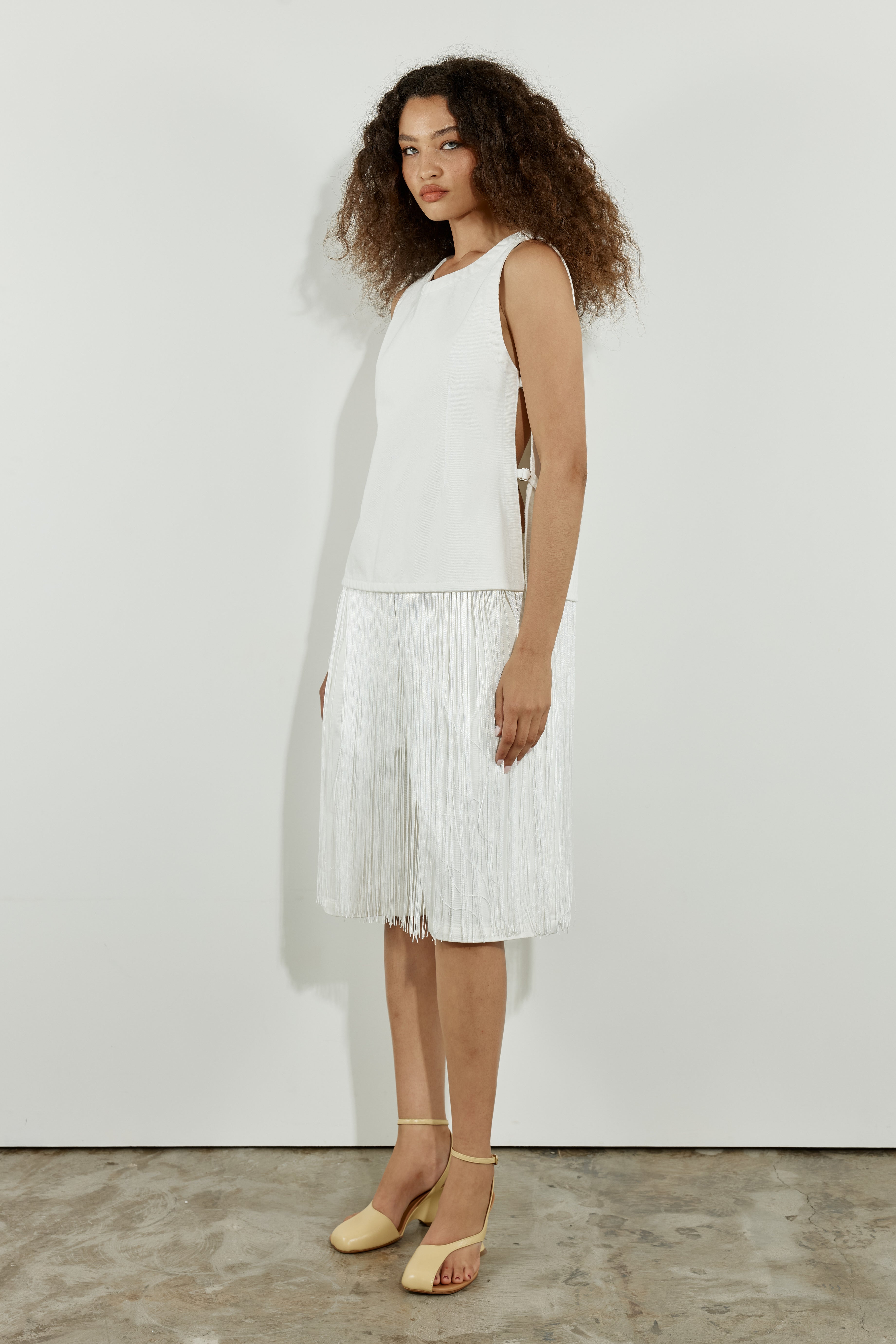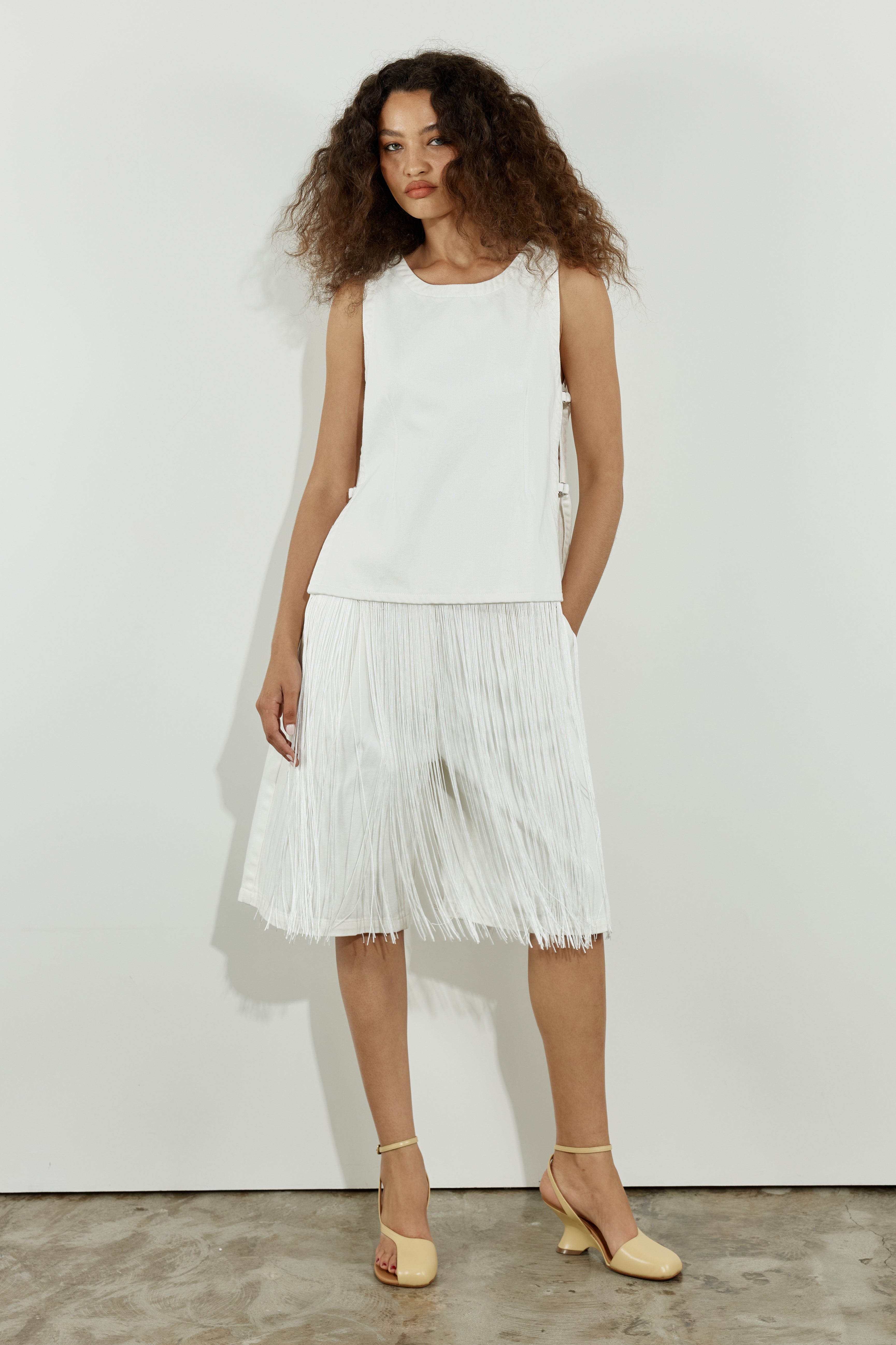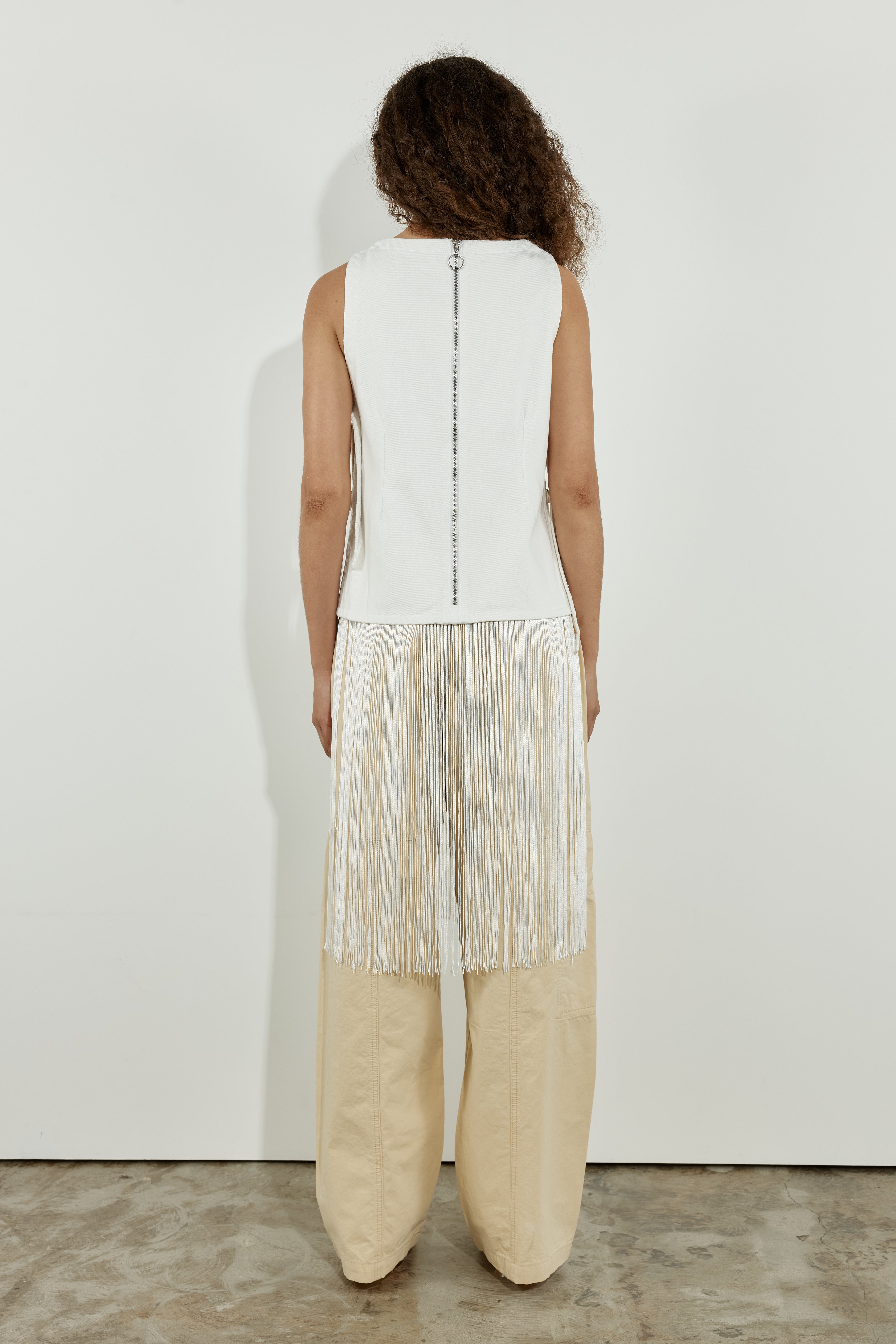 A sleeveless denim tank featuring adjustable side strap fastenings and long fringe detailing. Structured through the body with open sides for a clean, modern finish.