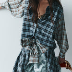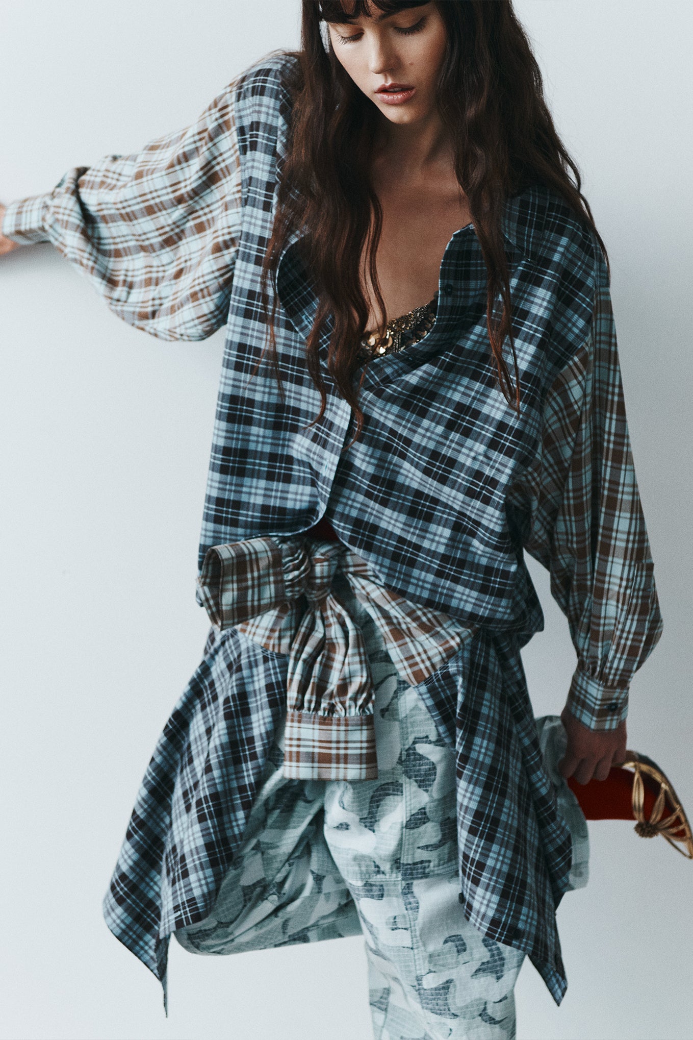 This oversized shirt features a relaxed fit with contrasting check patterns on the body and sleeve. Designed with a relaxed silhouette, voluminous sleeves, dropped shoulders, and a classic button-down front.