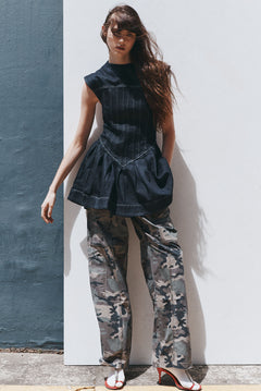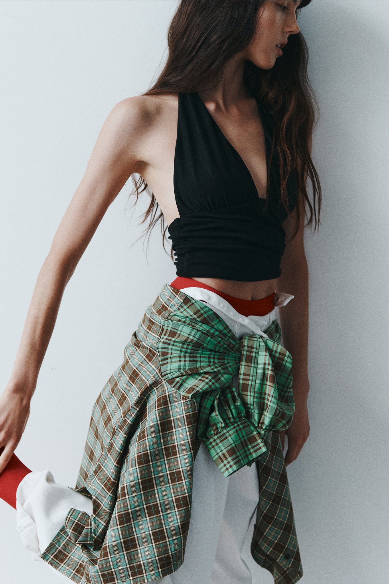 Our halter top is cut from a soft stretch cotton, allowing it to be pulled on over the body with ease. It twists as it ties up around the neck and features subtle gathering under the bust line. Designed to have an elongated bodice that is fitted throughout the midline and finish at the hip.