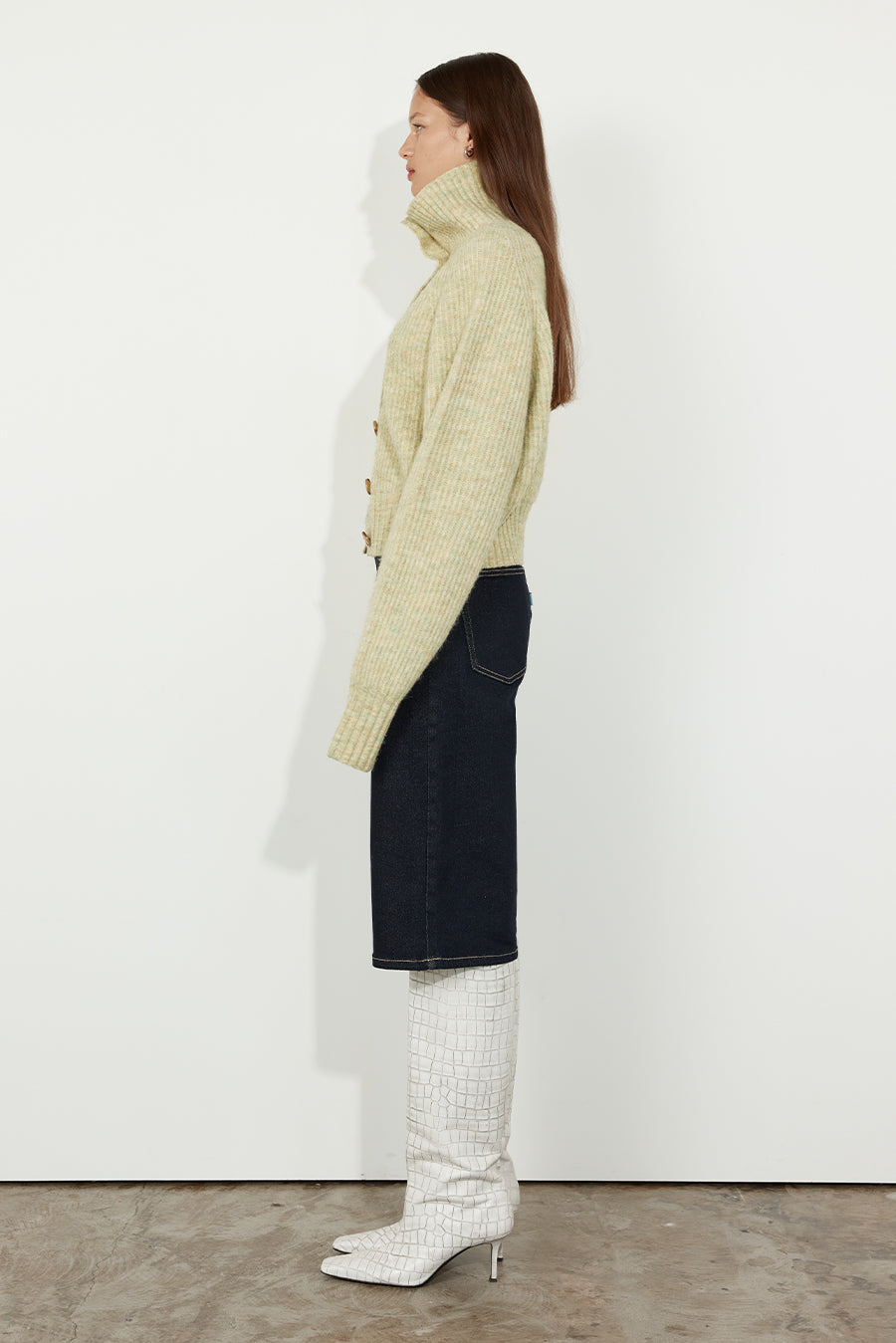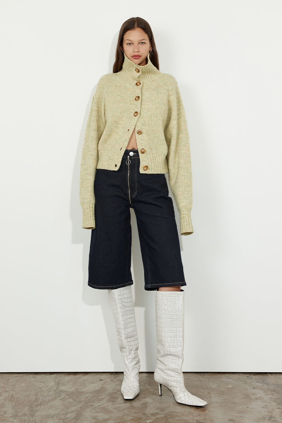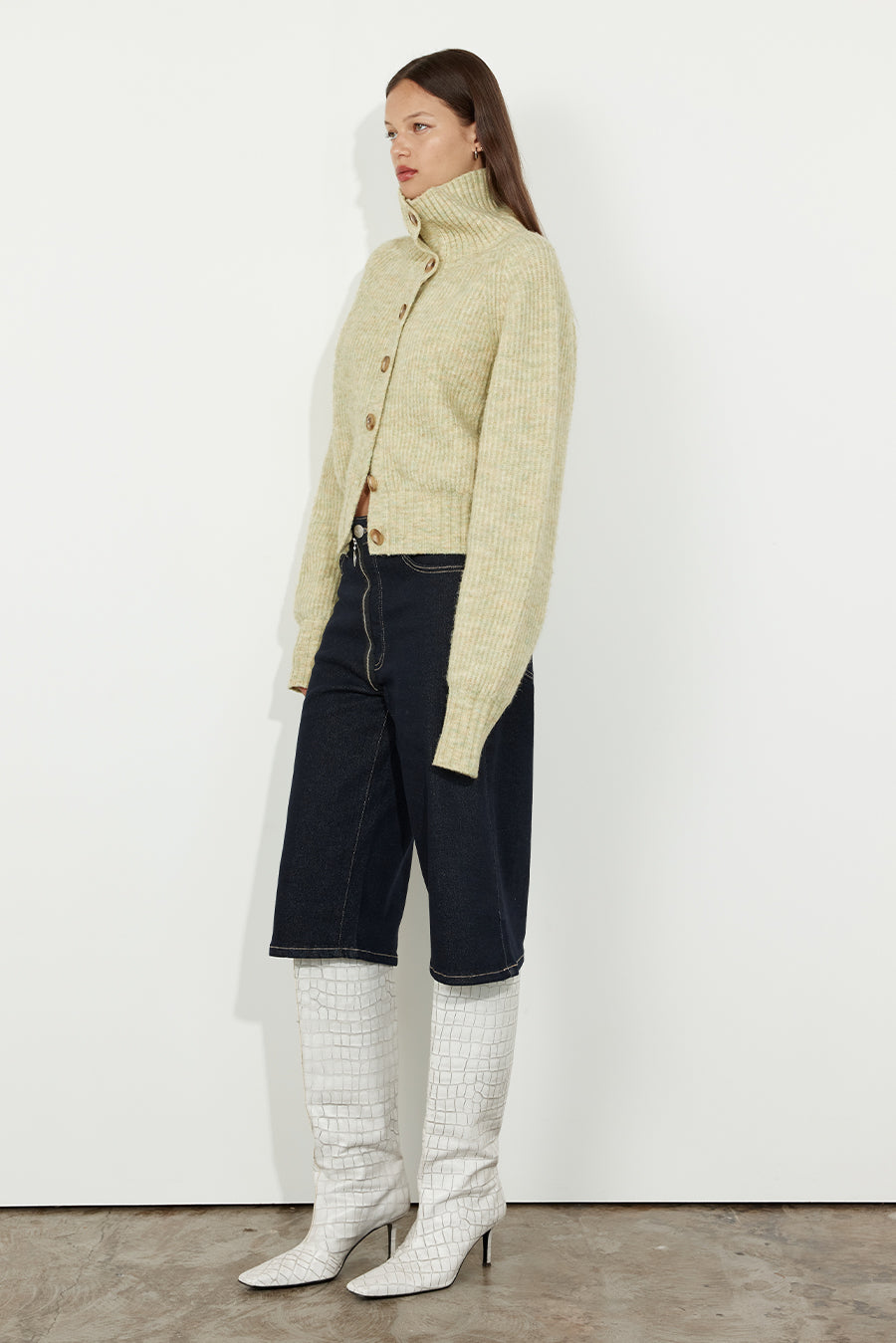 Our button up, high neck knit in soft chartreuse features soft voluminous sleeves and a high collar neckline, both subtly offset by a slightly more cropped length through the bodice.