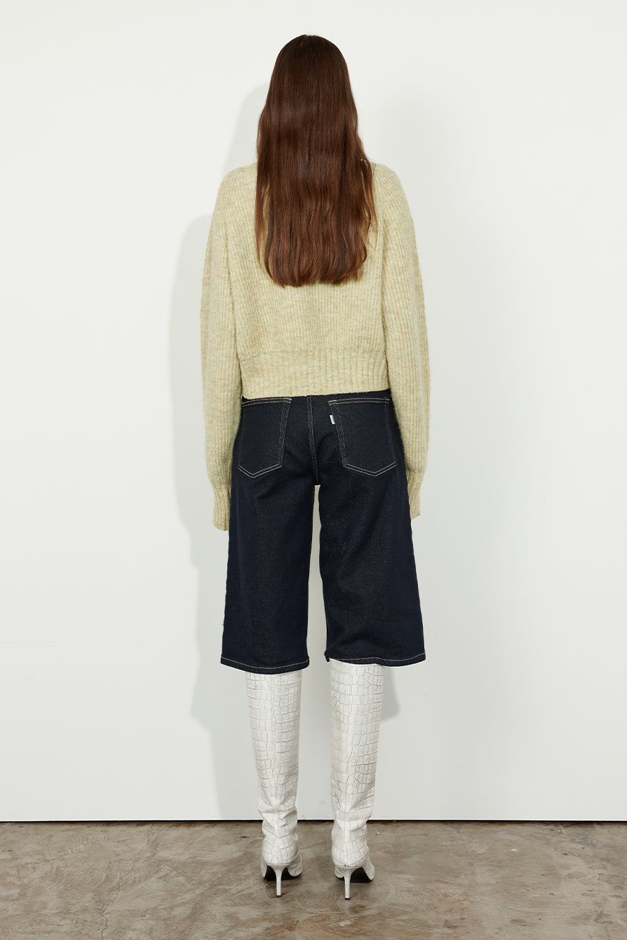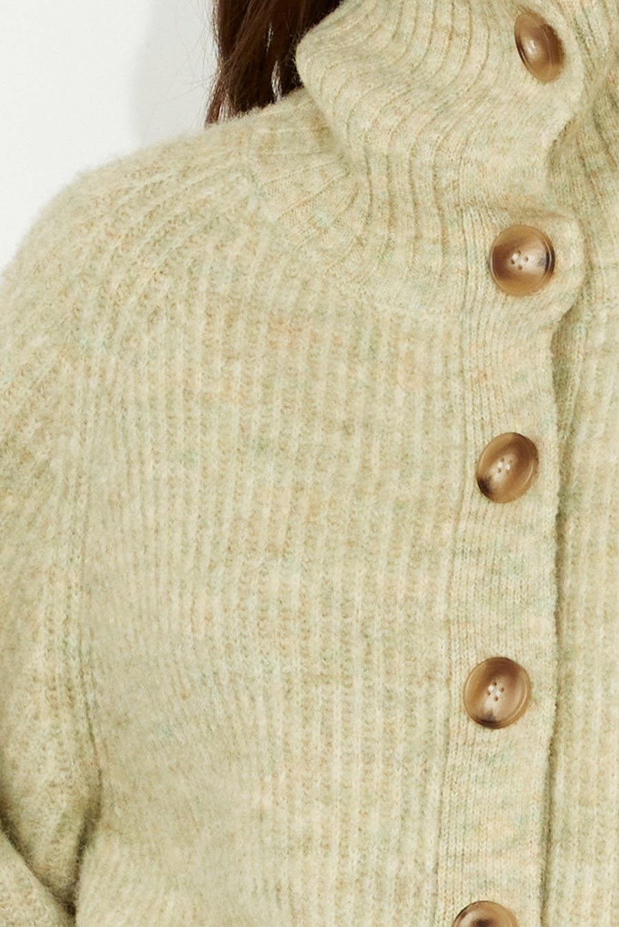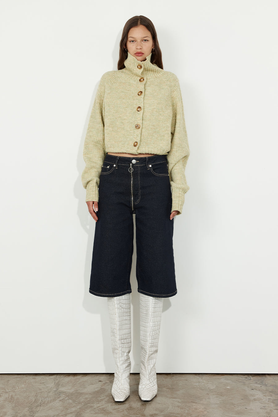 Our button up, high neck knit in soft chartreuse features soft voluminous sleeves and a high collar neckline, both subtly offset by a slightly more cropped length through the bodice.